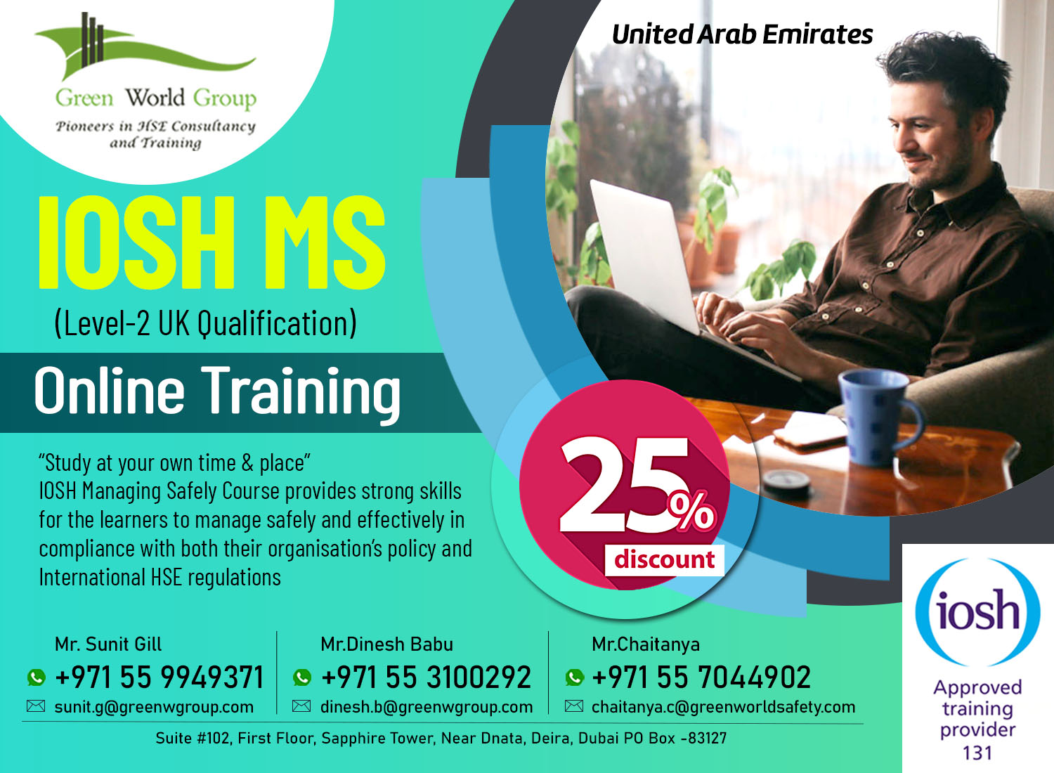 Green World Group is the leading safety training institute for Safety courses in UAE which has decade of experience in the safety training and we trained more than 10,000 professionals in all the premises. We provide IOSH Managing Safely Course online in our institute and it's the right time to complete the course from your own comfort.