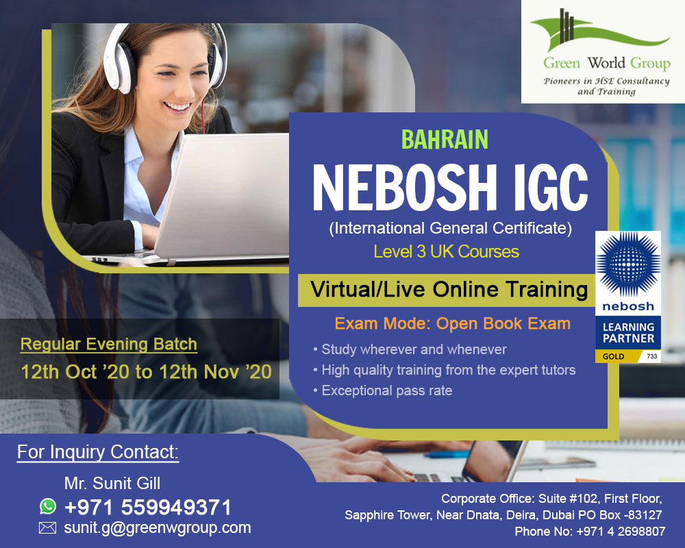 We have been providing regular weekend and evening Batches for NEBOSH Course in Bahrain via Online mode every month. Kindly book your seats now and Grab the Online offer...