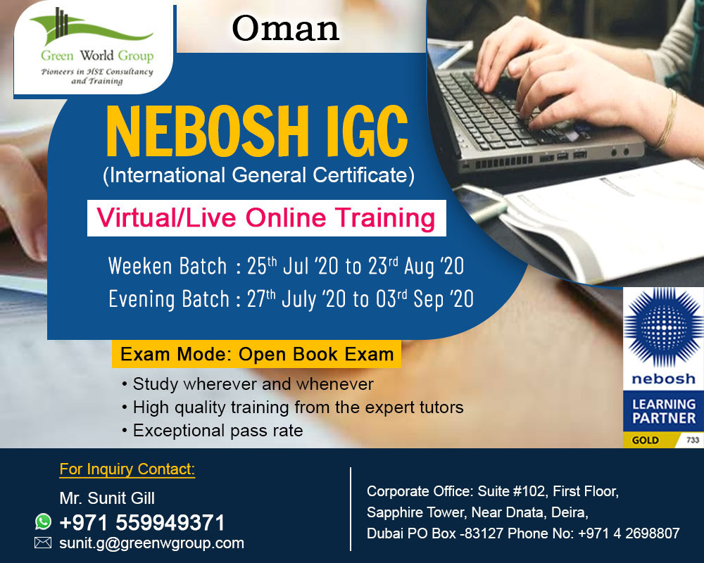 Green World Group is the NEBOSH GOLD Learning Partner Institute with more than 14 years of experience running across India, UAE, KSA, Africa and many other countries. This is the right time for you to complete your NEBOSH Training in Oman from your own comfort and our professional tutors will assist you in all the aspects of learning and support you to ace your exams in Oman.