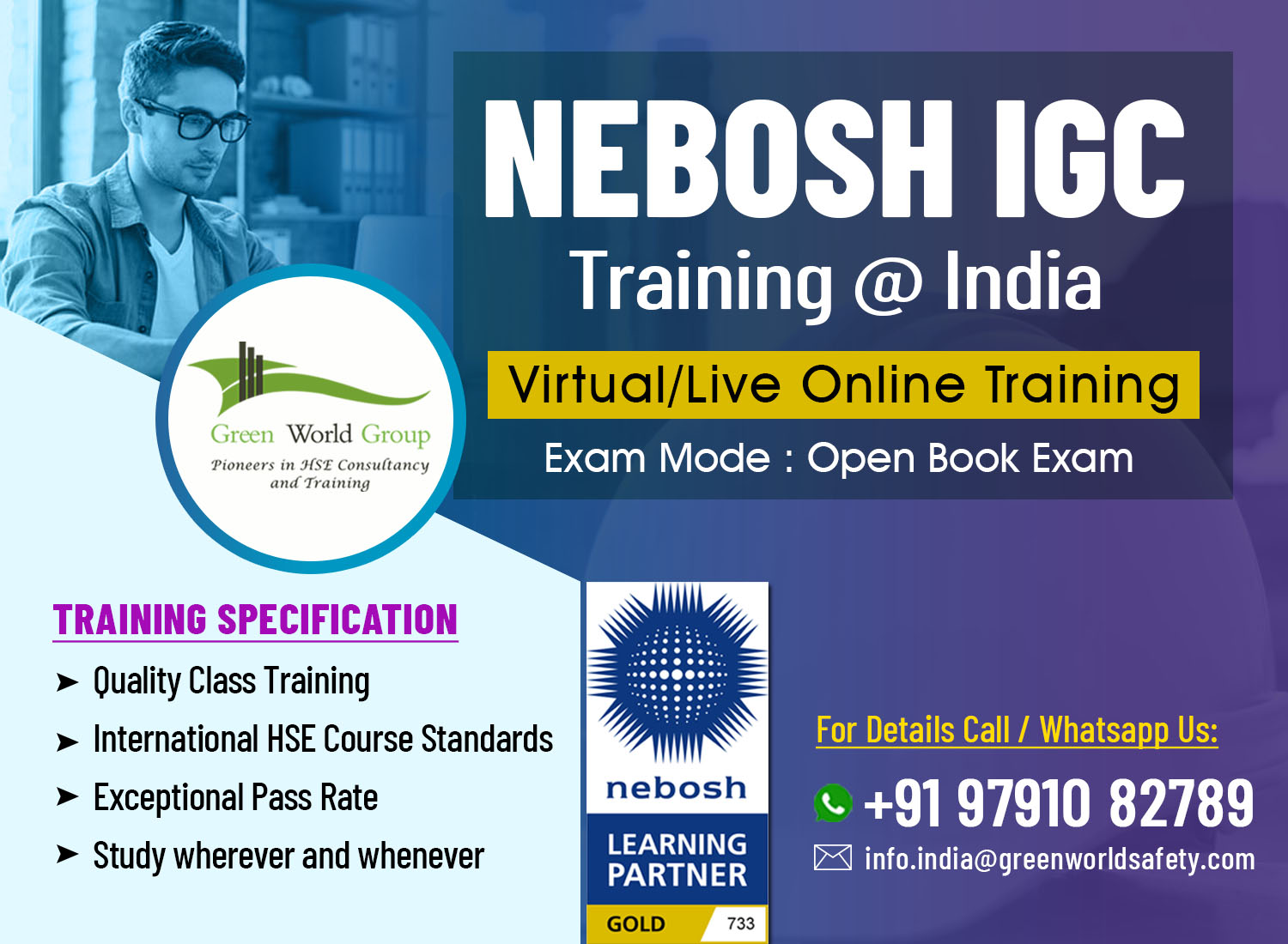 Pursue NEBOSH Training in India via E-Learning: Green World Group offers Live Training for Online NEBOSH Course in India via E-learning. Grab this online opportunity and gets employed in various industries in India and almost all over the world as a Safety Officer.